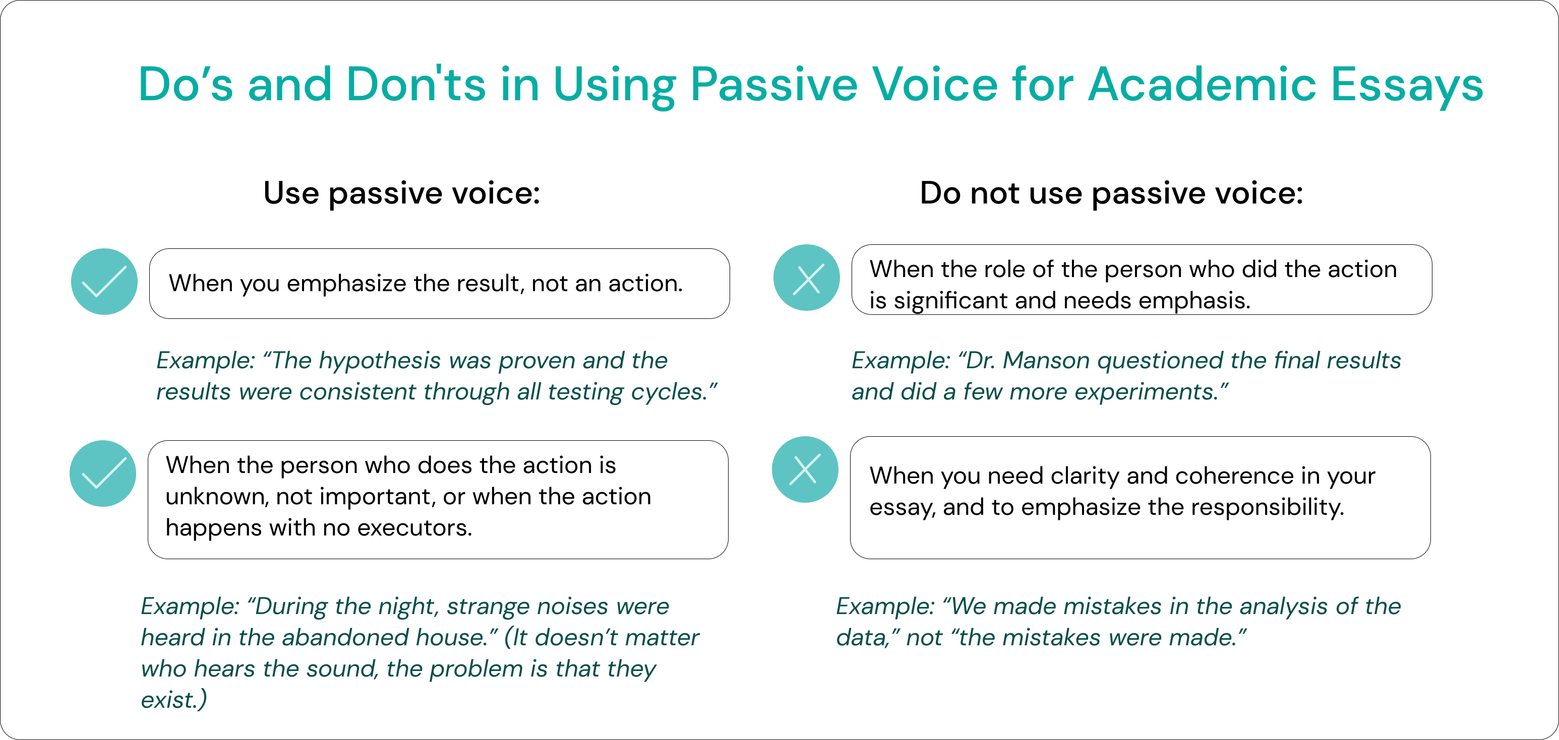 4. Extensive passive voice. Passive voice phrases are not the type of words to not use in an essay at all. Sometimes, there is no other way to say something except with passive voice construction. However, try rephrasing them to the active voice when possible. Word choice adds much to persuasive writing in such cases.