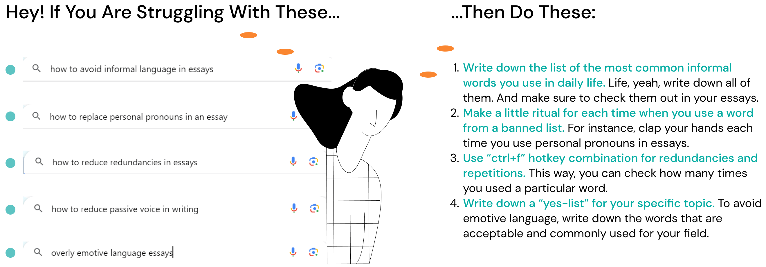 Okay, so you know what words to not use in an essay. You know its main types and common essay mistakes. But there are so many diverse tips to improve writing out there and so many points to work on. How can you do all that and yet control each of your words? I’ve got you. Here are some easy-to-do tips specifically for each mistake type: